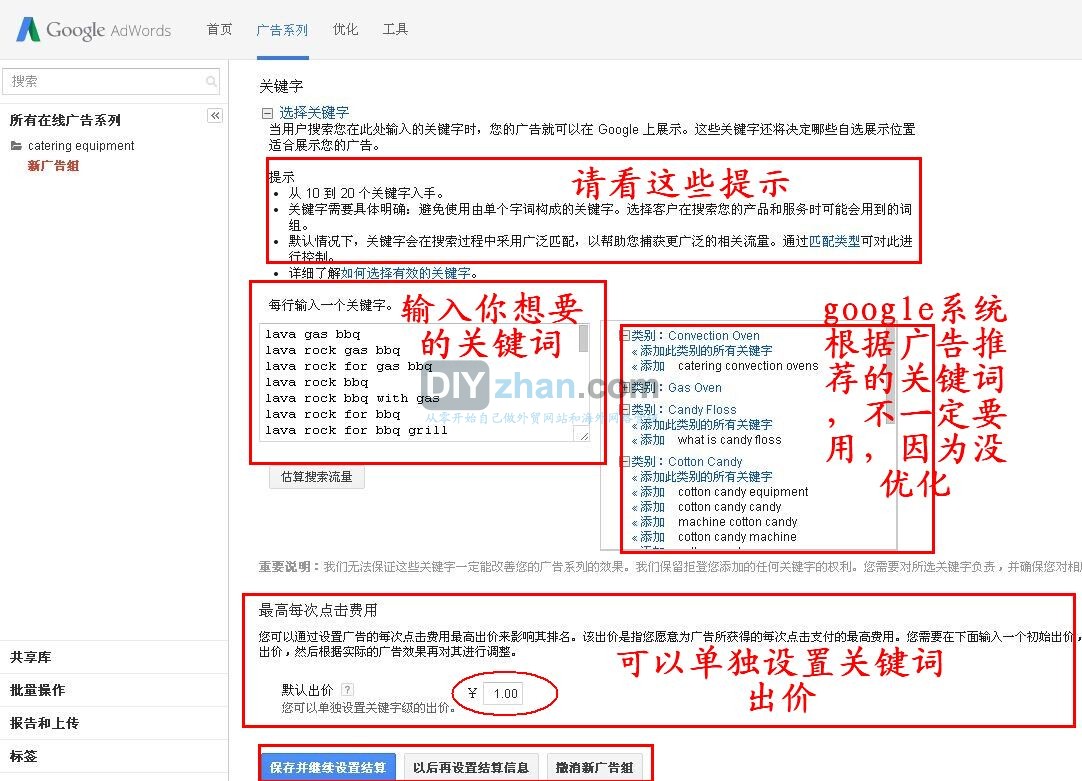 - 建好了广告后,我们为广告添加关键词,这些关键词是用户在google上搜索这些关键词时,你的广告就会显示在他们的搜索结果中;按照提示,输入10-20个关键词,避免使用单个字词构成的关键词,选择客户在搜索产品和服务时会用到的词组;设置制作了广告后,google会根据你的单词在右边自动生成一些热门的关键词给你参考,你可以选择添加到左边;广告要达到高点击率和低点击单价,要注意优化关键词,请看文章《》;